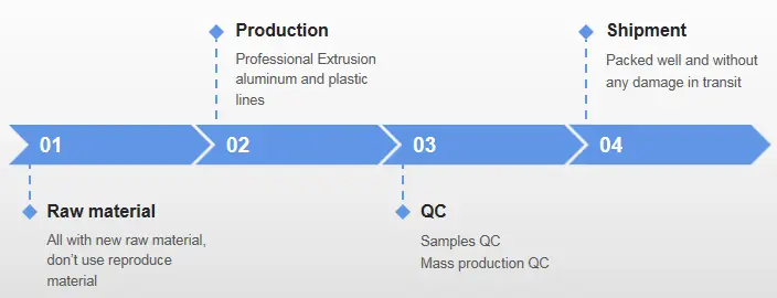 În calitate de producător profesionist de profil LED din aluminiu și profil LED din plastic, JE se concentrează întotdeauna pe calificarea produsului, de la materie primă din aluminiu și plastic până la linia de producție de extrudare, de la controlul calității mostrelor până la controlul producției în masă, de la pachet puternic și perfect până la servicii complete.